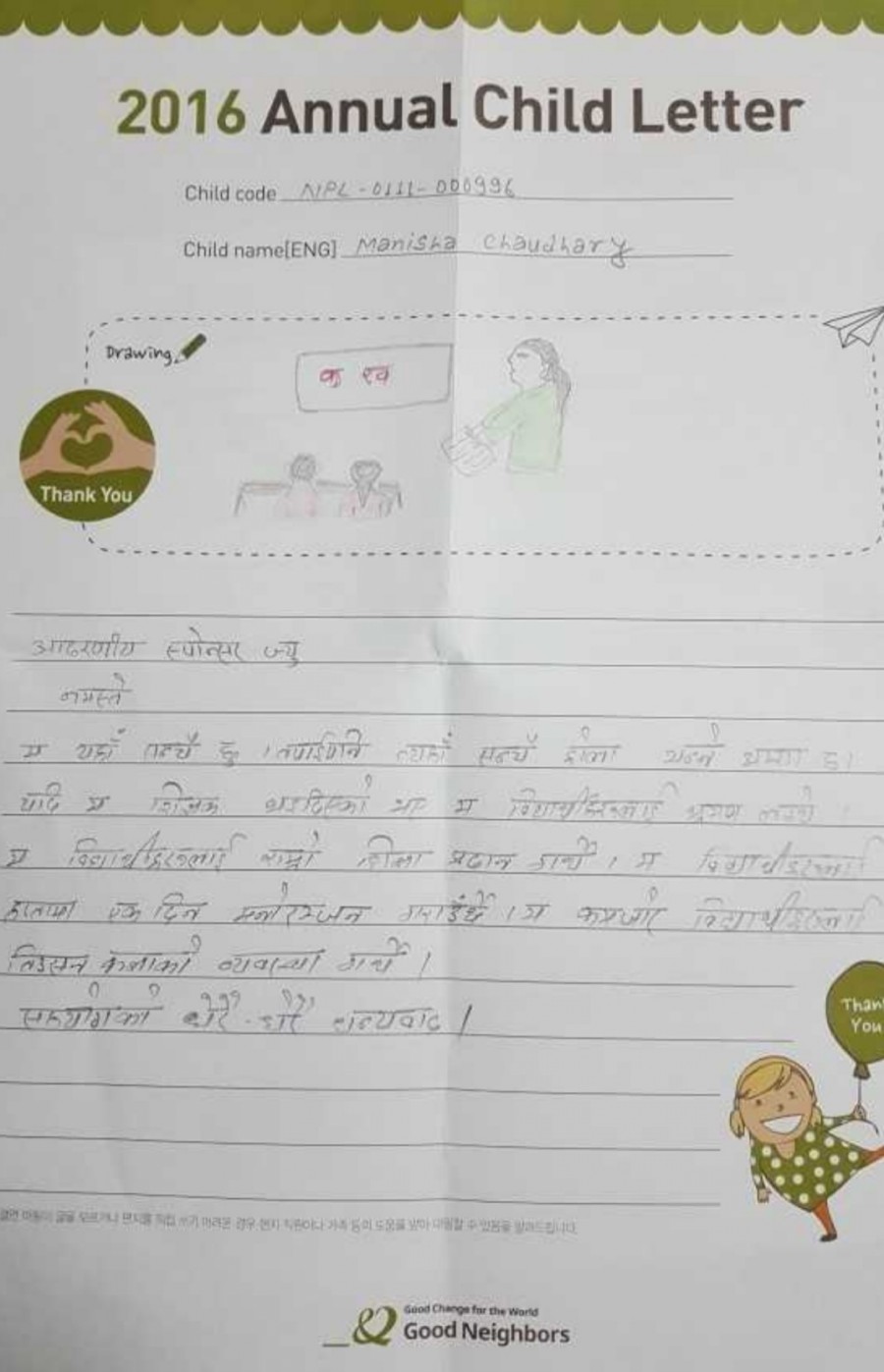 아주 우연히 인터넷의 광고를 보는데, 무슨 일인지 눈물이 주룩 흘렀습니다. 그리고 아무 생각도 없이 굿네이버스에 전화해서 후원을 하기 시작했습니다. 그리고 종종 외국의 아이들이 편지를 보내옵니다.