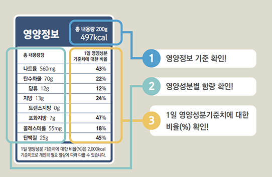 가공 식품의 일정한 기준량에 어떤 종류의 영양소가 각각 들어 있는 양에 대한 정보를 표시한 것입니다. 일정한 기준량은 식품 별로 100g, 100ml, 1인 분량, 1단위 포장(캔, 병, 봉) 등으로 정하고 있습니다.