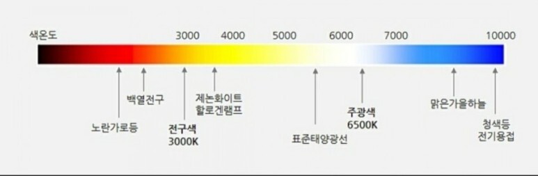 색온도는 1,000K ~ 10,000K까지 나눠지지만 보통 2,700K ~ 6,500K 범위의 색온도를 가지는 조명이 일상 생활에 사용이 됩니다.