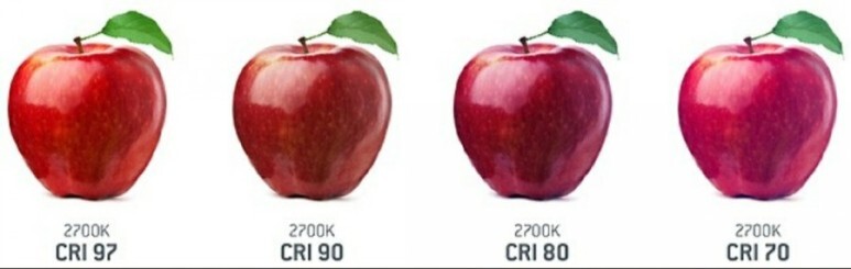 위의 사과는 같은 2,700K 색온도 조건 하에 있지만 연색성이 올라갈 수록 색감이나 생동감, 사과 본래의 색을 나타나고 있습니다. 바로 연색성의 차입니다.